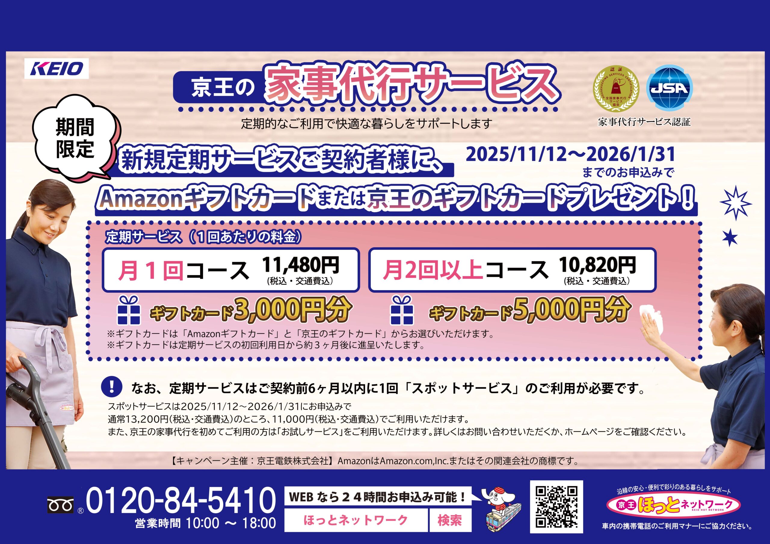 <その1>「定期サービス」を新規でご契約のうえ、3ヶ月間ご利用いだだくと「Amazonギフトカード」または「京王のギフトカード」どちらかお好きな方をプレゼント!